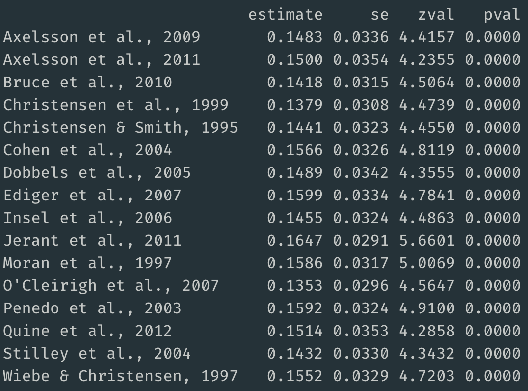 Let's fire up up R and have a closer look. Here, I'm going to load up the metafor package and use one its built-in meta-analysis datasets. This meta-analysis dataset from Molloy and colleagues explores the relationship between conscientiousness and medication adherence.