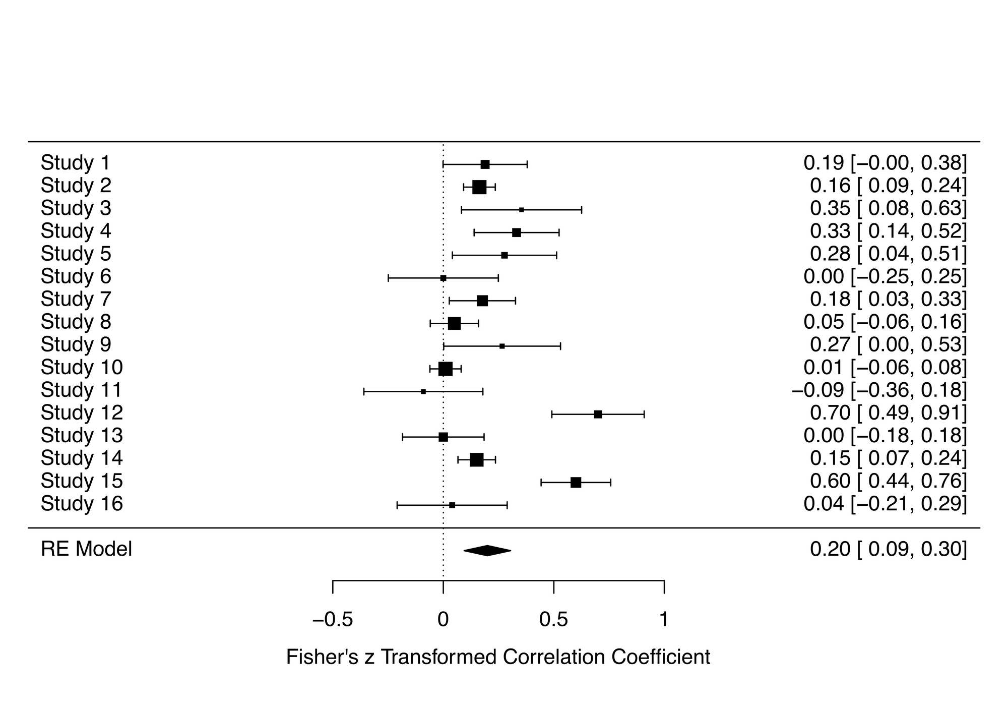 forest_plot <- forest(res)Let's look at the forest plot that was generated from this script. The summary effect size was 0.15, and this was statistically significant, suggesting a modest relationship between conscientiousness and medication adherence.