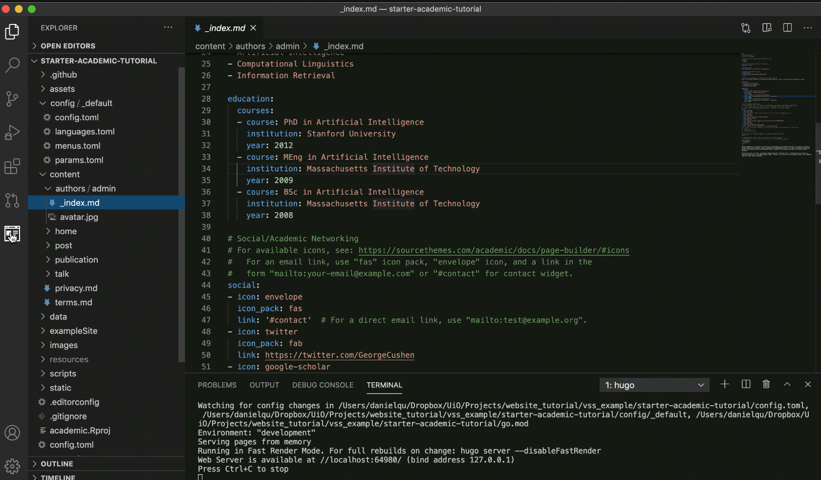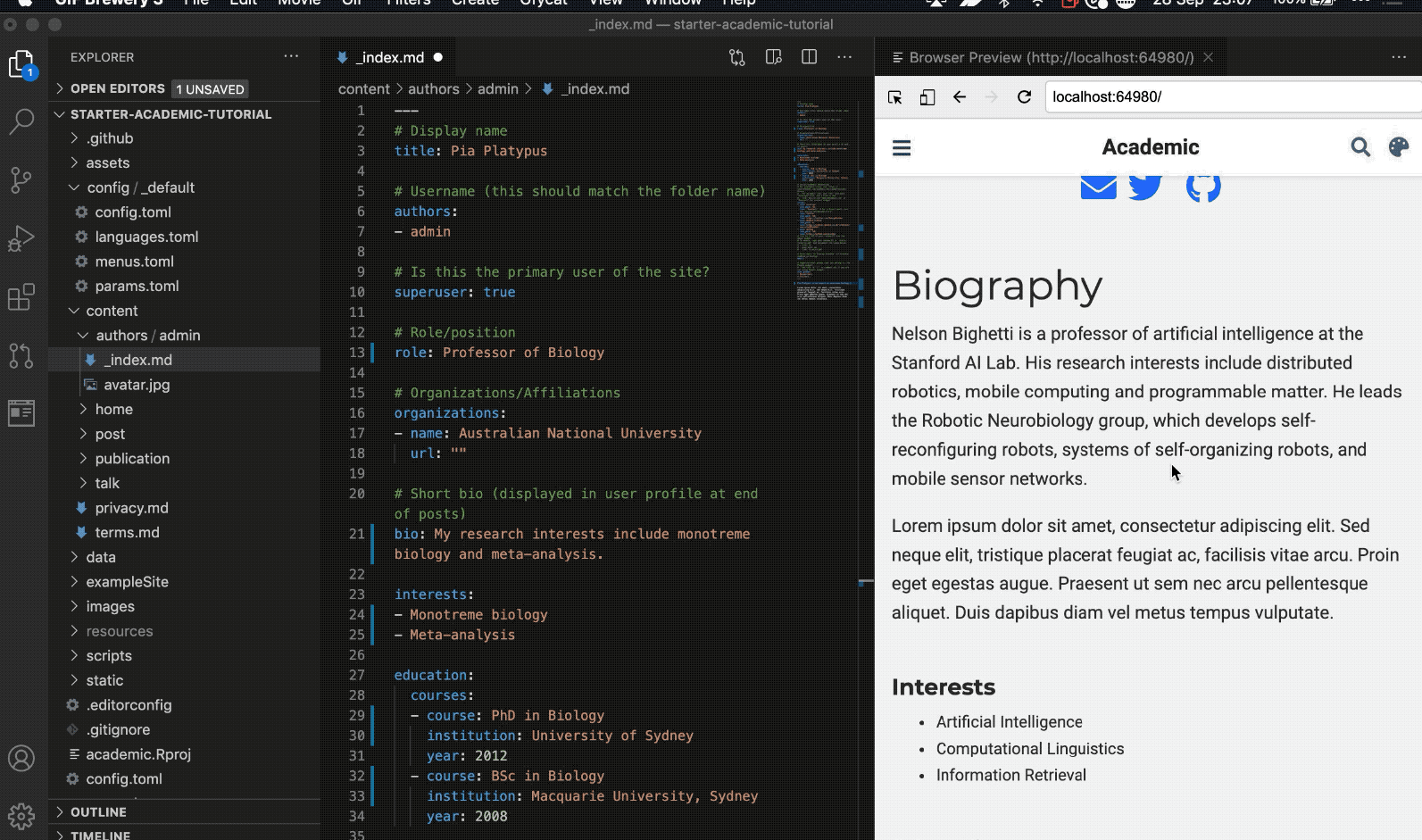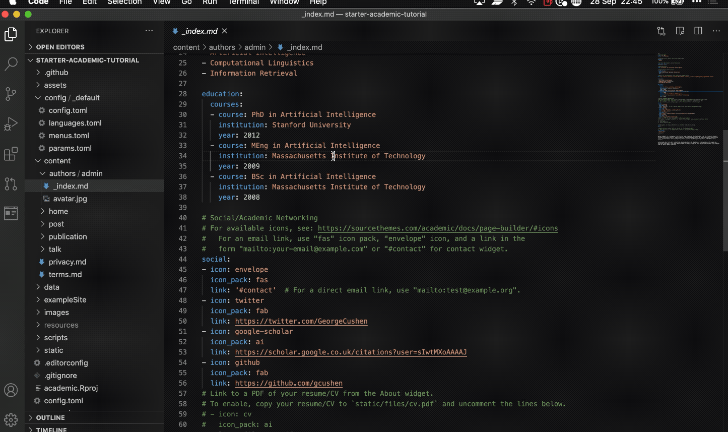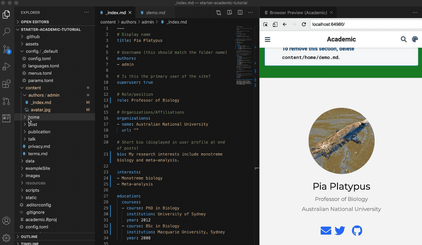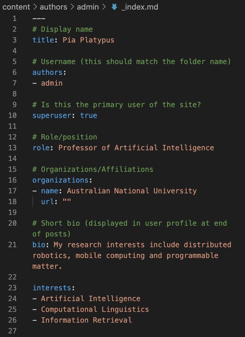 The first thing you're going to do is to change the name and picture. Navigate to "content/authors/admin", and then open up the "_index.md" file. Here you can change your display name, role, affiliation, short bio, and research interests.