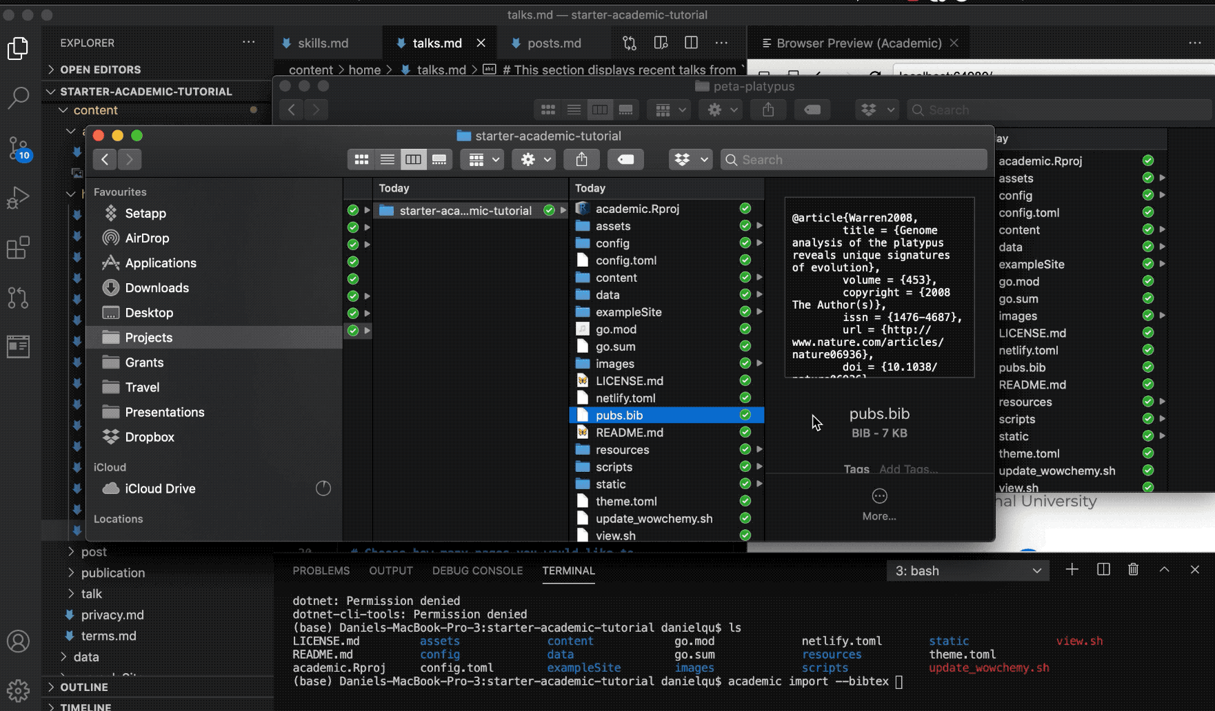 One of the most important elements of your website is your publication list. There's a SUPER easy way to import all you publications via a bibtex (.bib) file. Simply export a list of your publications from your citation manager (I recommend Zotero) as a .bib file, and then put this file in your main website folder.