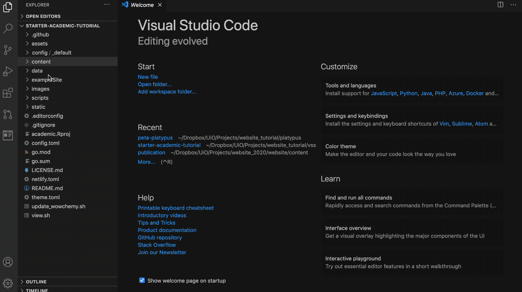 Your files are now in Visual Studio Code. Most of the files that you're going to be working with are in the "config" and "content" folders.