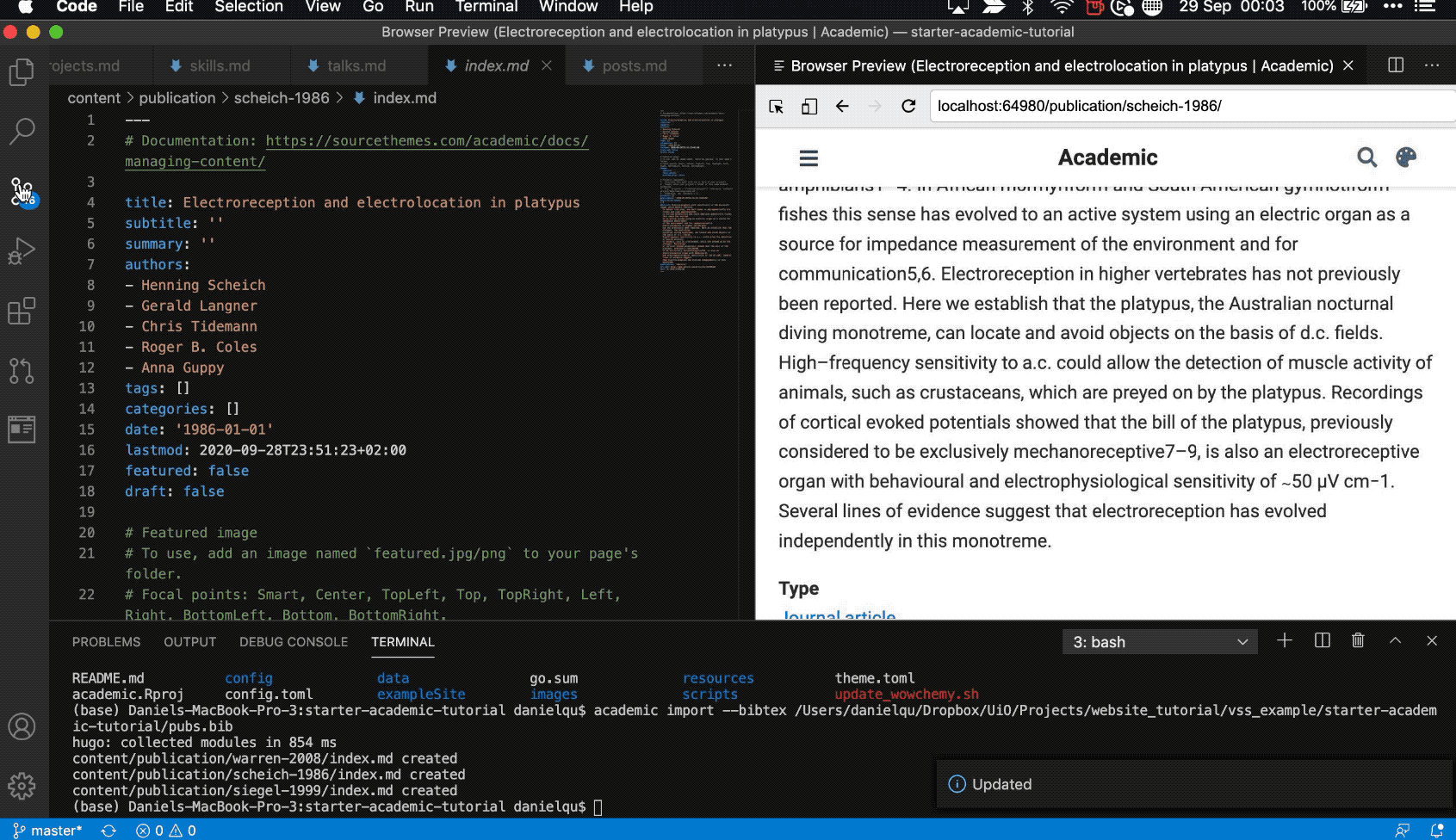 Assuming you've installed Python 3, bring up a Terminal window in Visual Studio Code, and then type in the following command: pip3 install -U academic