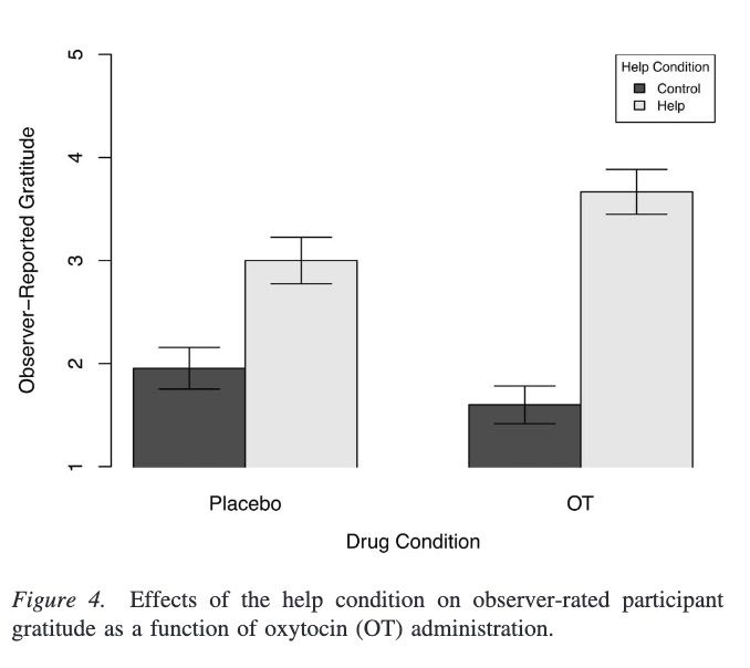 The authors reported a significant interaction effect of treatment condition (oxytocin vs. placebo) and whether participants received help or not on observer-rated gratitude. That is, participants in the oxytocin condition expressed greater observer-rated gratitude in response to receiving help [ F(1, 63)4.32, p < .05]. Participants in the oxytocin condition also expressed greater observer-rated greater happiness, but this effect was on the border of conventional statistical significance [ F(1, 63)3.73, p < .06].