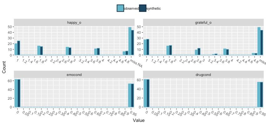 Here's the output from this analysis, which visualizes the distribution of our four variables of interest. We can see that synthetic counts (dark blue) are similar to the observed counts (light blue).