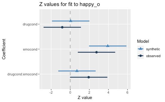When we compare our models, we can see for that there's no significant difference between our synthetic and observed data for the interaction (p = .22 with a CI overlap of 0.67). This code also generates a useful plot.