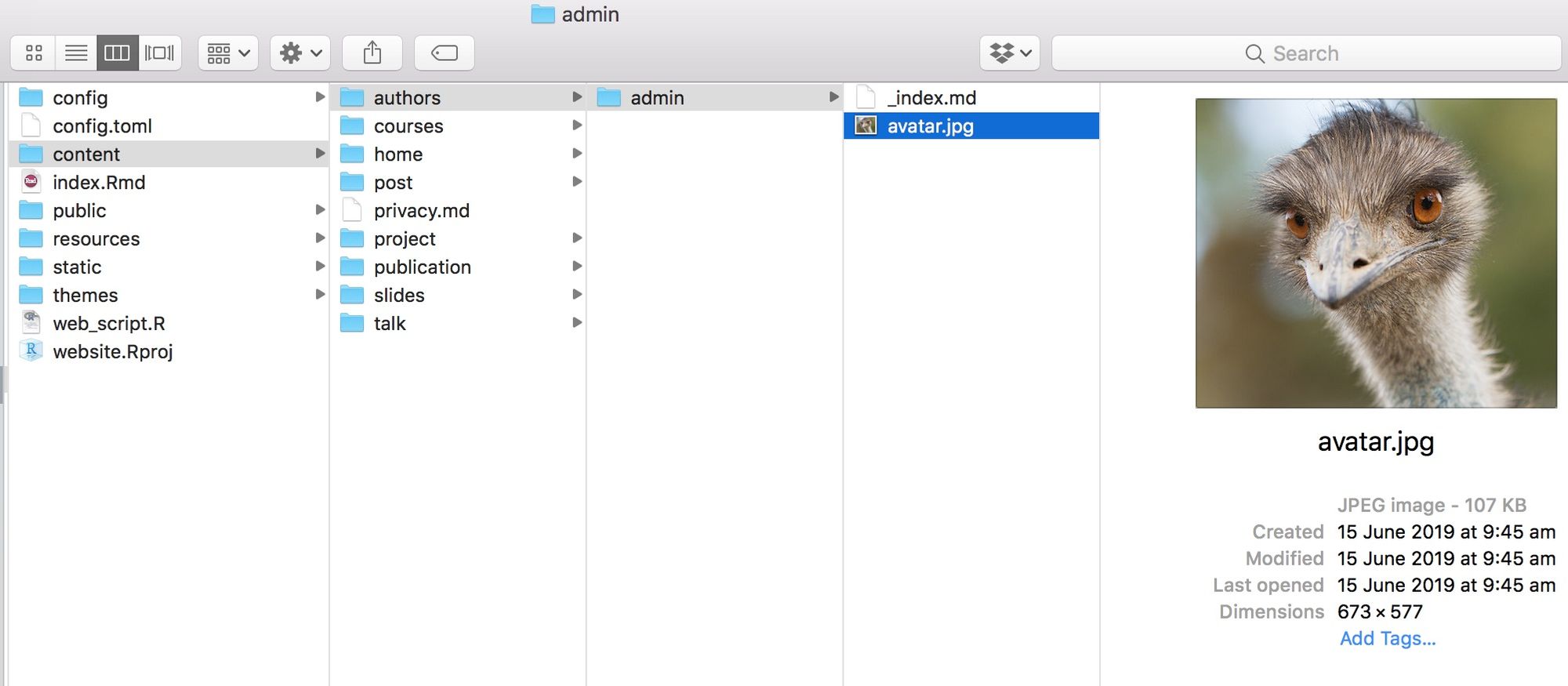 Let’s now update the profile photo. Just save your profile in the content/authors/admin folder, calling the file avatar.jpg. This will automatically update your profile picture.