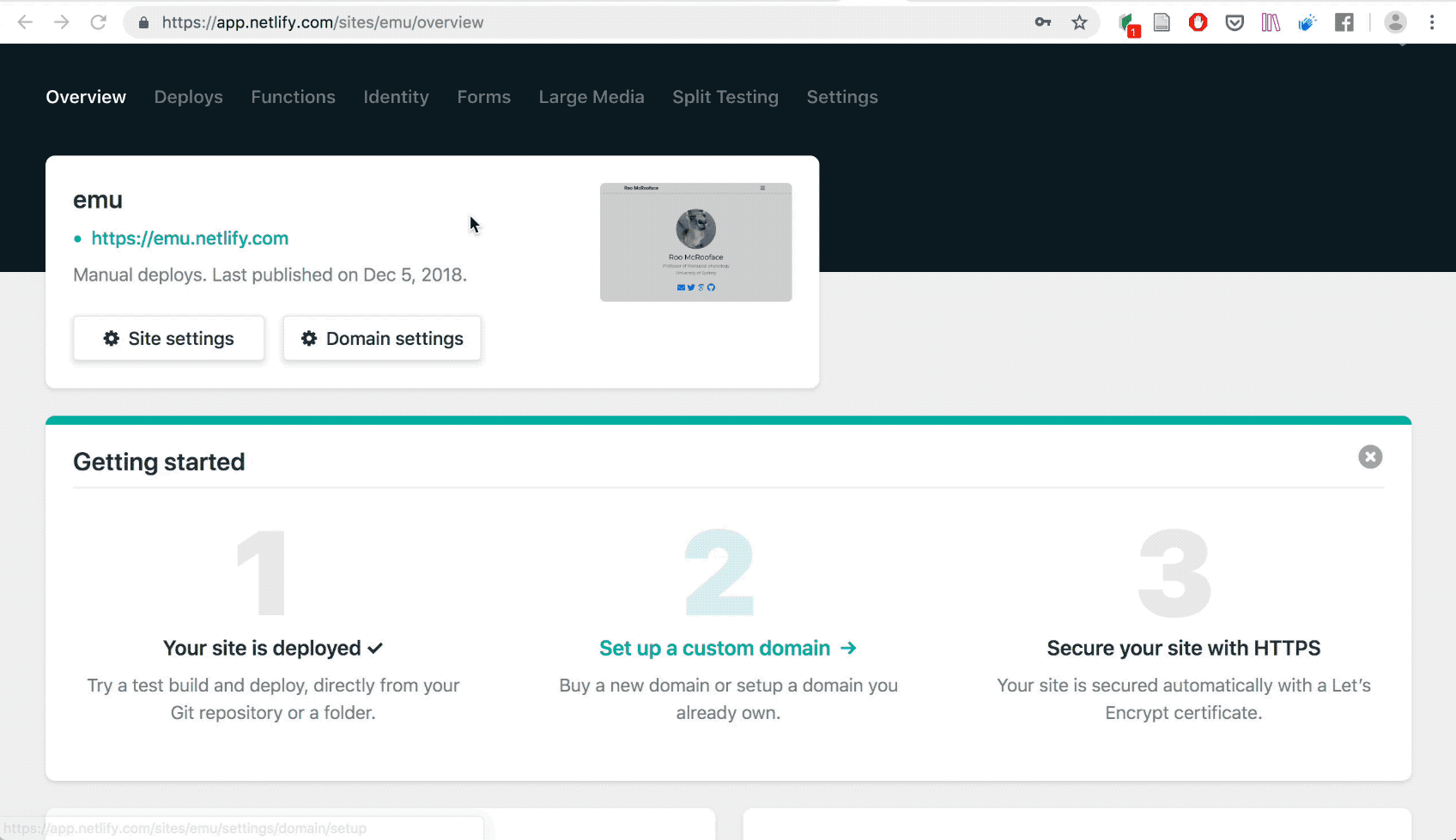 You can edit your domain name, which will include "netlify.com” at the end of your address. If you would like a cleaner domain name, you’ll can purchase one for the cost of a few coffees per year. I recommend Namecheap, who is currently offering free domain names for university students.