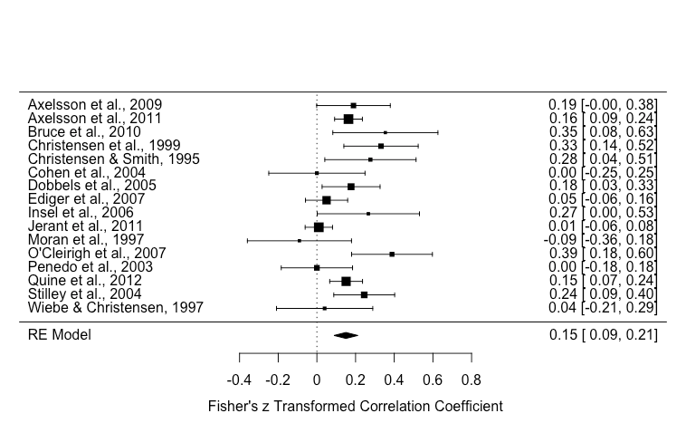 Of note, there was significant heterogeneity [Q(df = 15) = 38.1595, p-value = 0.0009] and the effect size estimate was 0.15 (p < .001).