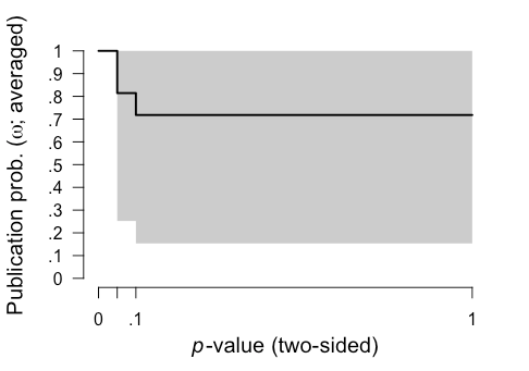 The "Model-averaged estimates" section also provides interesting information regarding the relative probability of publication of results of significant (the omega[0,0.05] row), marginally significant (the omega[0.05,0.1] row), and non-significant (the omega[0.1,1] row) results. This analysis suggested there was 100% probability that significant results (p < 0.05) were published, which is a consequence of how the model was set up, a 81.4% probability that marginally signficant results (.05 < p < .10) were published (relative to significant studies), and 71.8% chance that non-significant results (p > 0.1) were published (relative to significant studies).