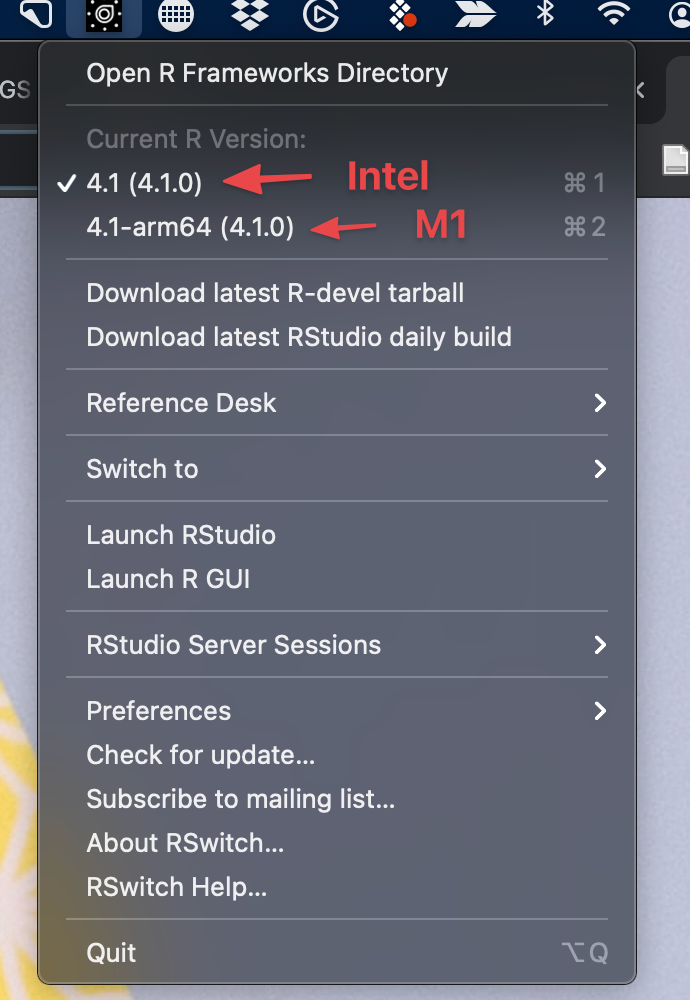 In the image above, you can see that I have both Intel and M1 versions of R 4.1 installed, and I currently have the Intel version running.