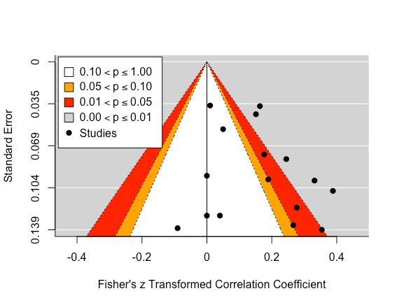 This plot show us that a few studies are lying in the 'significance' contours. While eyeballing this plot doesn't elicit too much concern for publication bias, this would still be a subjective conclusion.