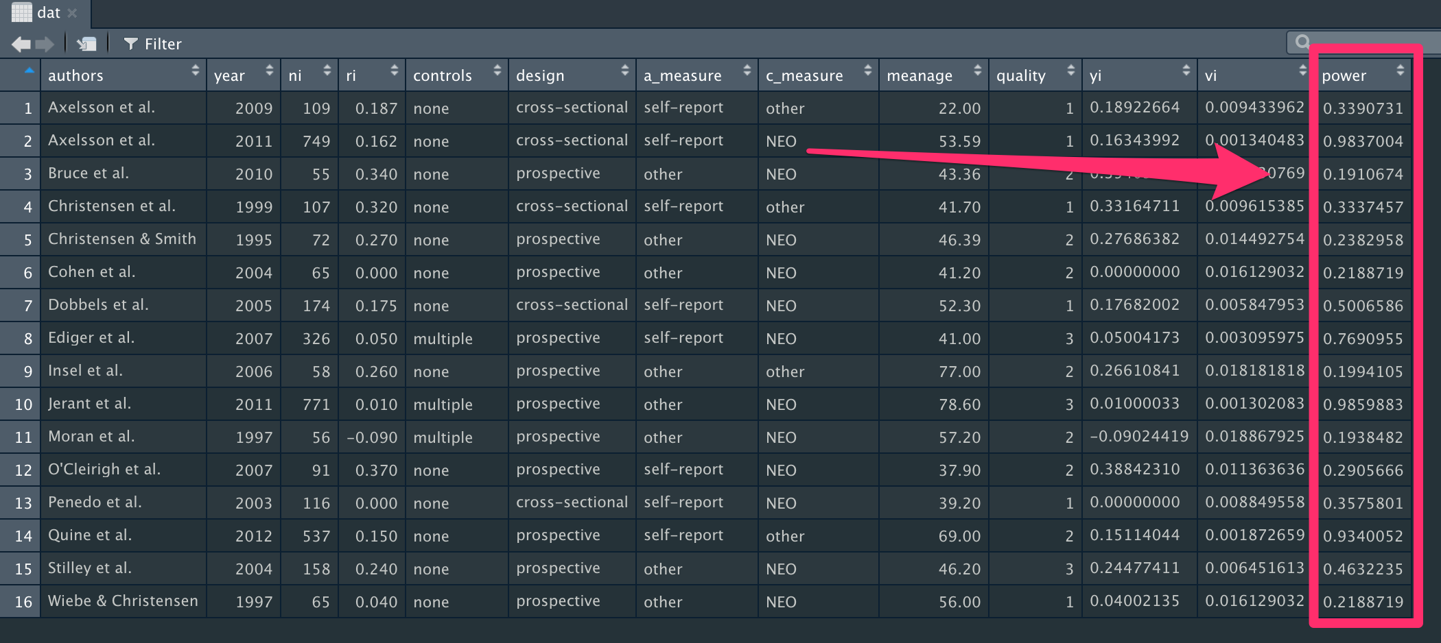 }Let's use this function to add power calculations to each study using a true effect size of 0.15. We also need to specify the standard error for each effect, and significance level. Here, we're using data from the funnel plot we made earlier to extract the standard error information.