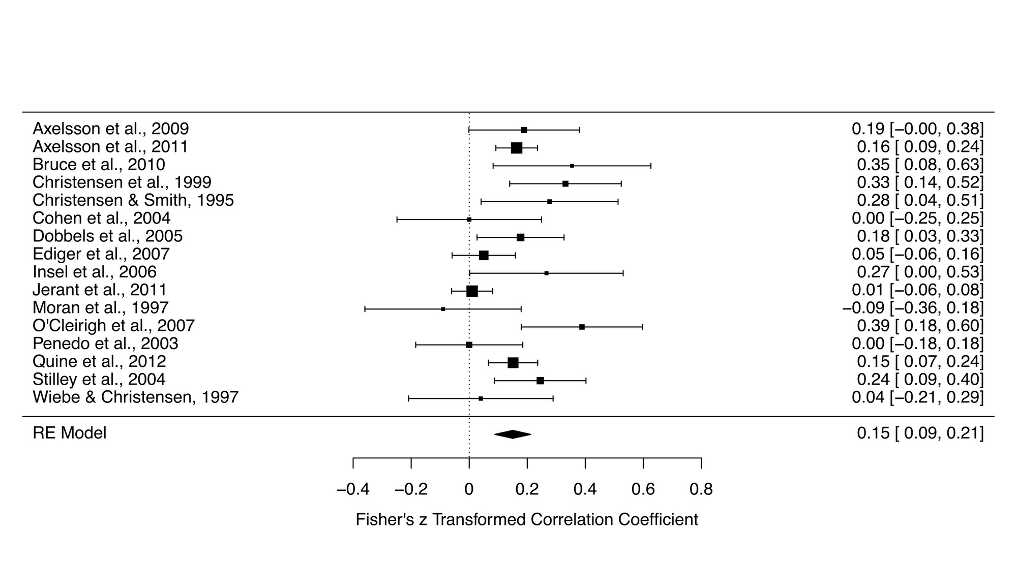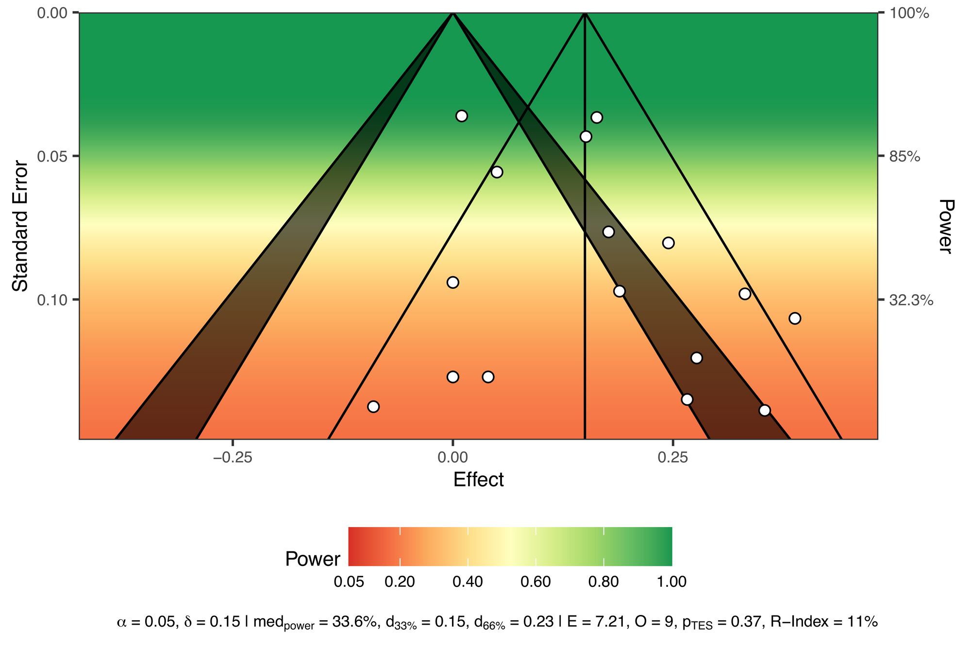 - Results from a test of excess significance (i.e., given the data we would expect 7.21 statistically significant studies and we observed 9, yielding a p-value of 0.37)