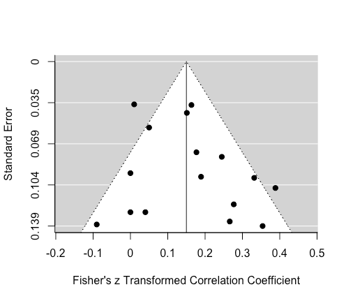Let's also make a funnel plot, which illustrates the potential for small-study bias by plotting each effect size against its standard error, centred on the estimated summary effect size.